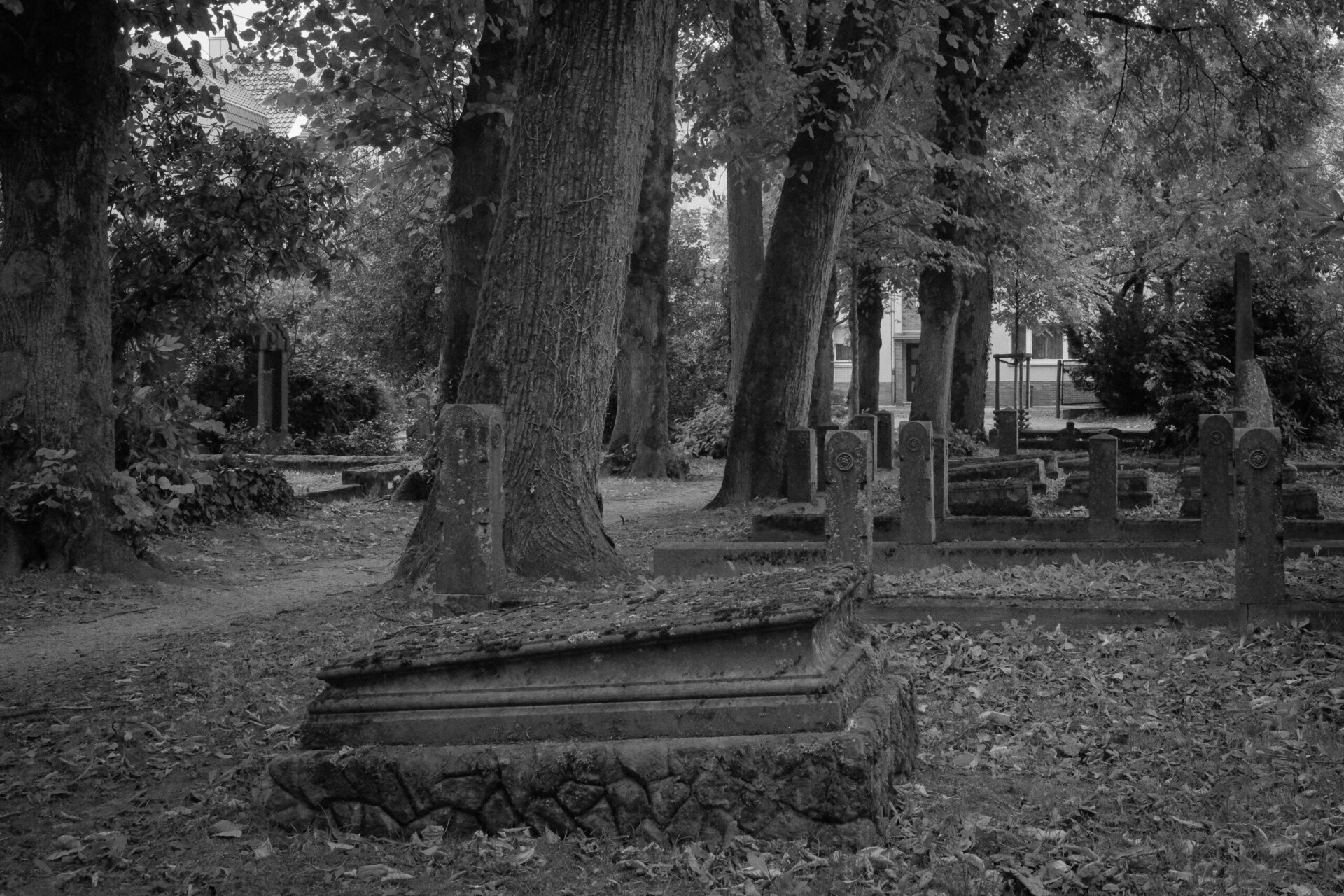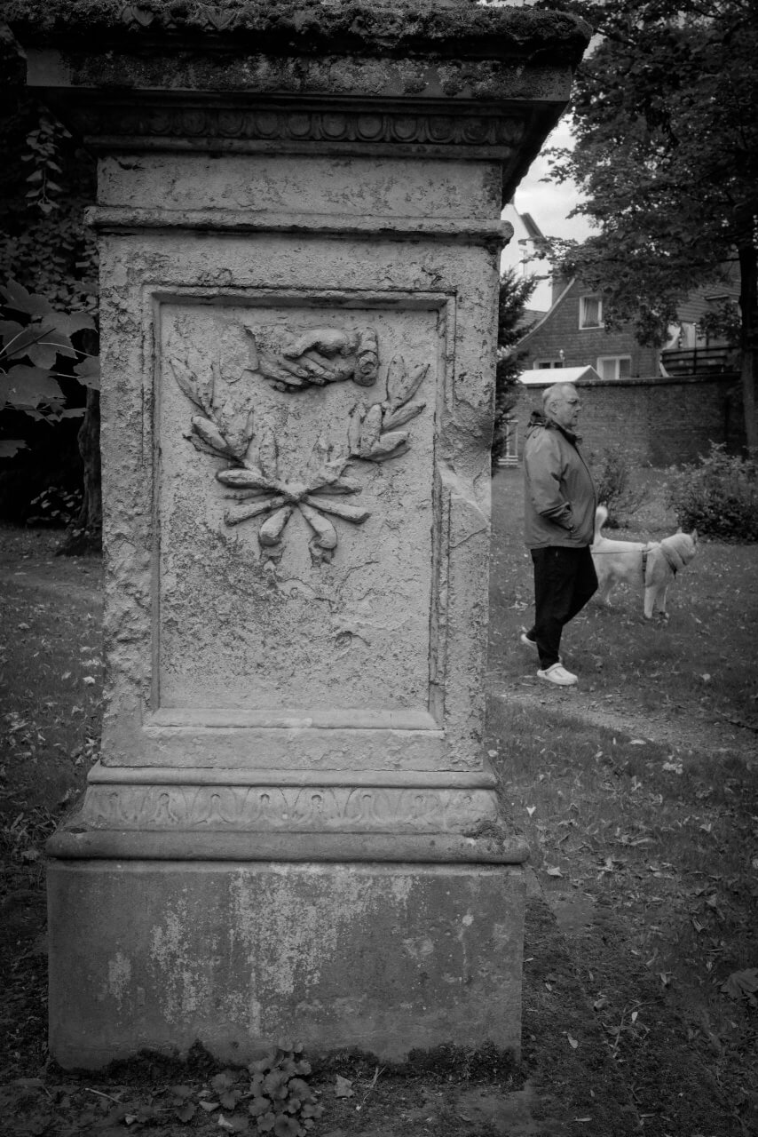 Der Baumbestand wirft dichte Schatten, das Licht dringt an vielen Stellen nur vereinzelt durch. Das schafft eine bedrückende, introvertierte Stimmung. Verwitterte Grabsteine, Moos, Flechten, alte Inschriften – all das bietet reichlich Material für Nahaufnahmen oder abstrahierte Details.